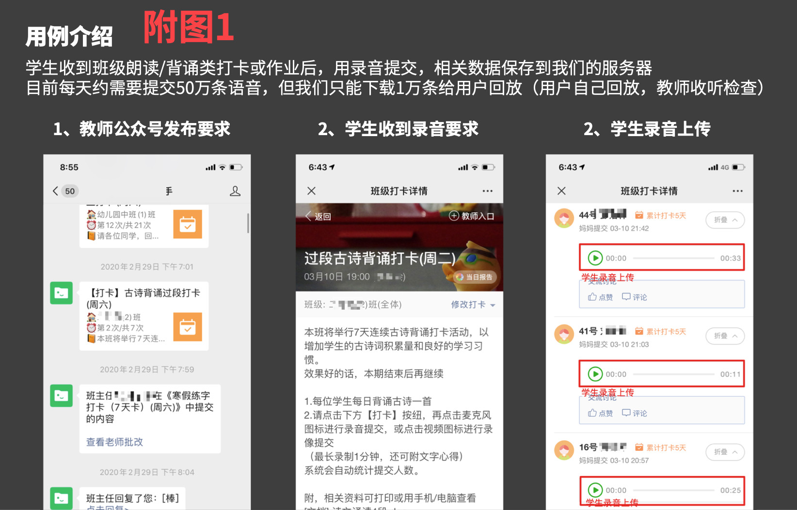 2)本服务号包含一个重要功能:学生语音朗诵,教师在线评阅(见附图1:用例介绍);