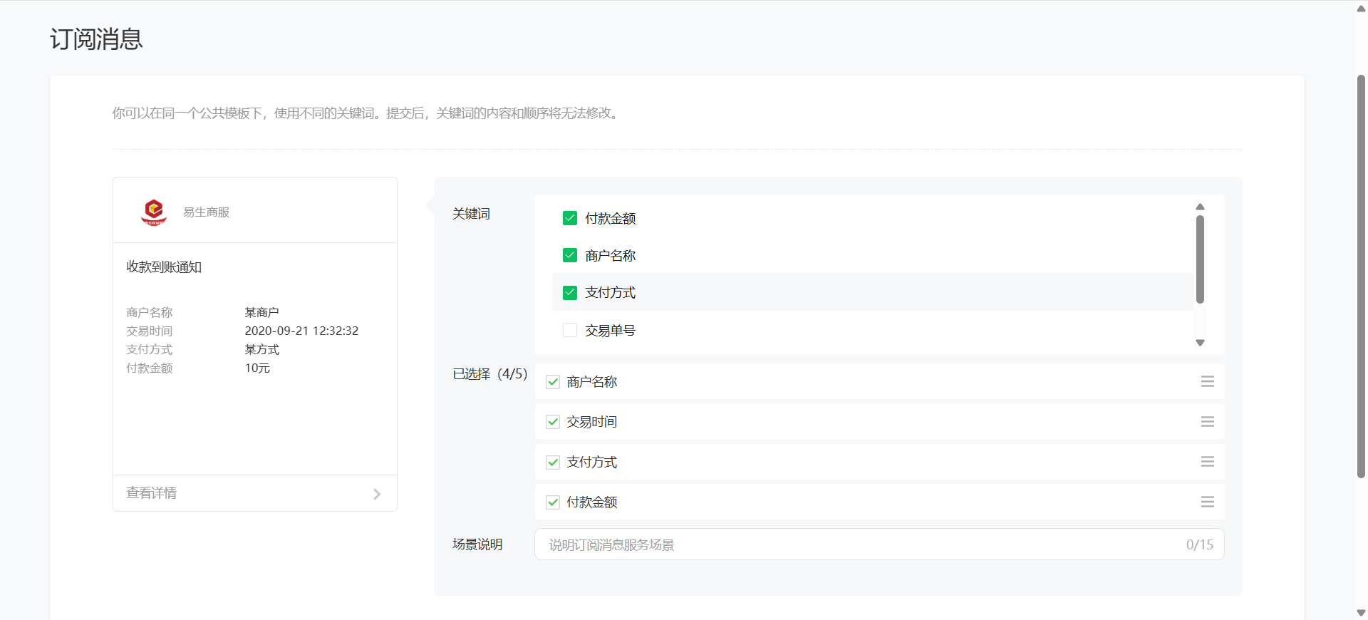 小程序订阅消息功能上线后,发现有些交易服务通知没有推送,查阅官方文档后发现订阅消息模板,phrase的参数值限制在五个汉字以内,但是我们小程序的应用场景中,很多的支付方式都是超过了五个汉字,这个有其他方案可以解决吗?