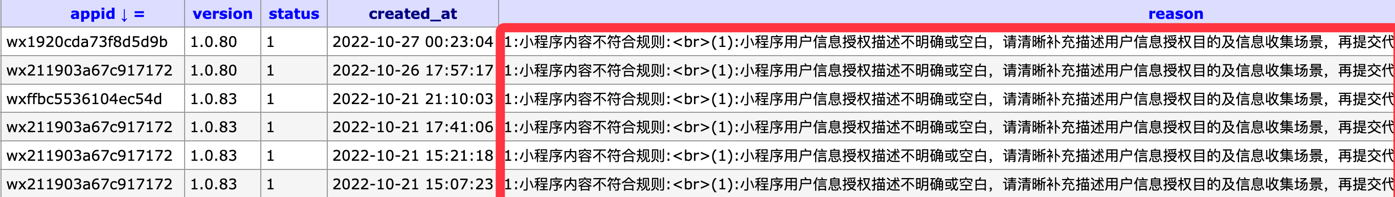 但是昨晚提交了3个小程序,过了1个啊,其他2个都是提示上述错误,下面是最近提交的小程序错误数据记录
