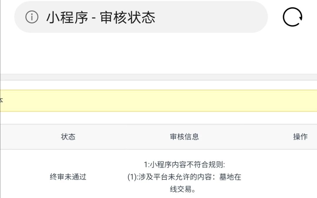 你好,经核实,你的小程序确实涉及平台未允许的内容:墓地在线交易。请重新定位小程序功能
