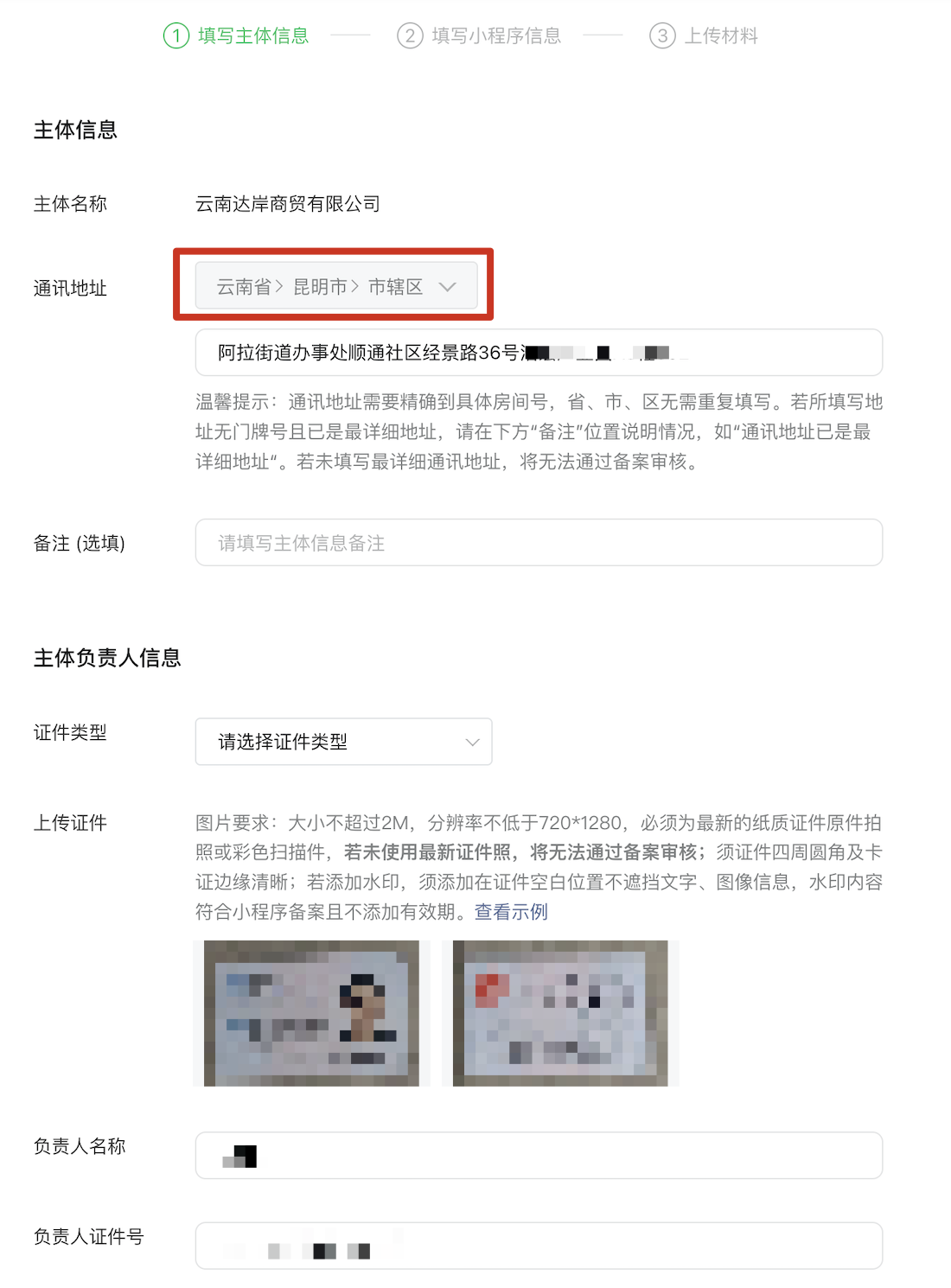 - 提交审核表单中的“通讯地址”无法修改,原经营地址为:“中国(云南)自由贸易试验区昆明片区经开区阿拉街道办事处顺……”,而选择地址中不只能选择行政区划,此前选择了“云南省/昆明市/市辖区”