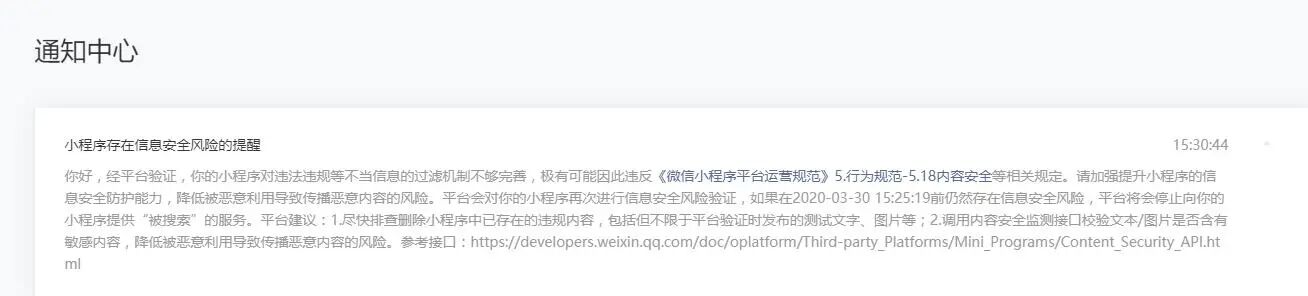 你好,经平台验证,你的小程序对违法违规等不当信息的过滤机制不够完善,极有可能因此违反《微信小程序平台运营规范》5.行为规范-5.18内容安全等相关规定。请加强提升小程序的信息安全防护能力,降低被恶意利用导致传播恶意内容的风险。平台会对你的小程序再次进行信息安全风险验证,如果在2020-03-30 15:25:19前仍然存在信息安全风险,平台将会停止向你的小程序提供“被搜索”的服务。平台建议:1.尽快排查删除小程序中已存在的违规内容,包括但不限于平台验证时发布的测试文字、图片等;2.调用内容安全监测接口校验文本/图片是否含有敏感内容,降低被恶意利用导致传播恶意内容的风险。参考接口:https://developers.weixin.qq.com/doc/oplatform/Third-party_Platforms/Mini_Programs/Content_Security_API.html