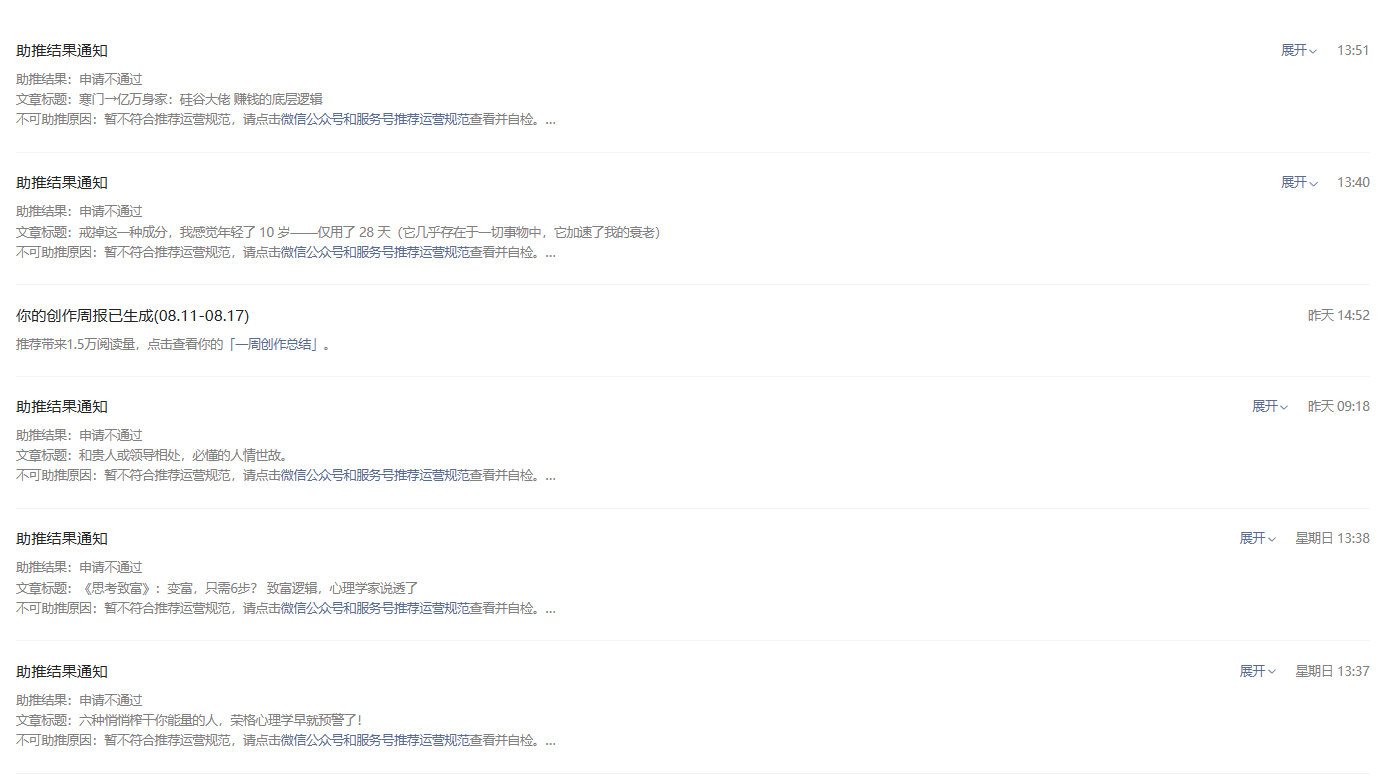 在8.15开始,有大概10篇推文选择助推,都是秒回 “审核不通过”,但是在“通知”中没有提示具体原因,只是给了一个规范。