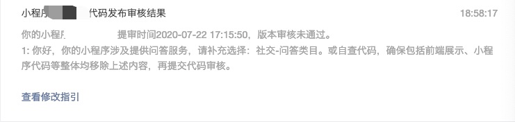 你好,经核实,小程序涉及提供问答服务,需补充选择:社交-问答类目。或自查代码,确保包括前端展示、小程序代码等整体均移除上述内容,再提交代码审核。页面路径:pages/plantingCircle/addNewQuestion/main.html、pages/plantingCircle/addComment/main.html、pages/plantingCircle/main.html、pages/plantingCircle/addQuestion/main.html