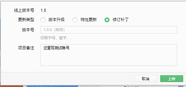 实在微信开发工具上传代码有个浮窗,那里边填写项目版本号和备注,实在备注里边填写测试账号吗?