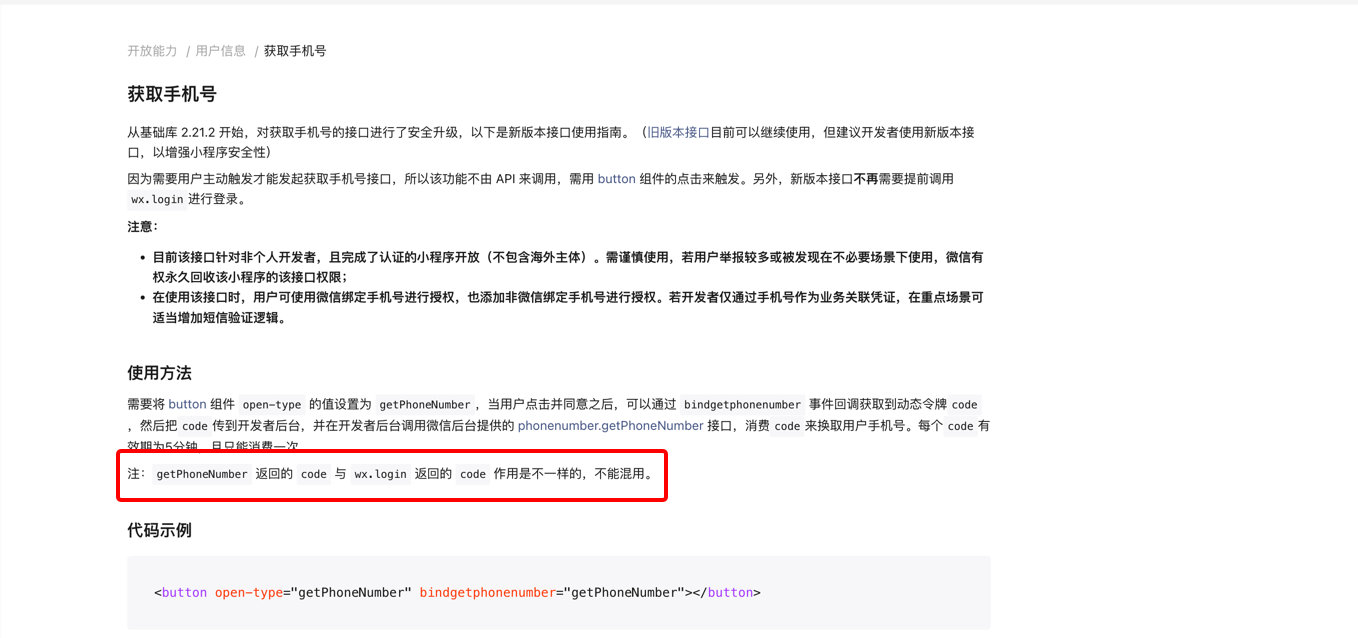 并且该文档特意提到“getPhoneNumber 返回的 code 与 wx.login 返回的 code 作用是不一样的,不能混用”