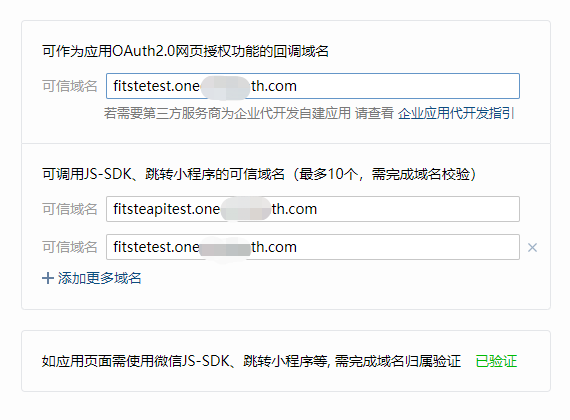 企业微信开发的时候,获取访问用户身份的时候信息返回 redirect_url需使用应用可信域名,可信域名已经在配置了人如下图