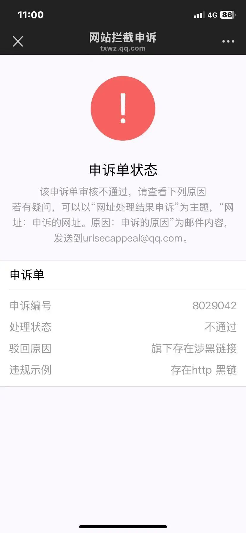 网站拦截申诉被驳回,原因“站下存在涉黑链接”,域名已备案,其余浏览器可访问,麻烦再次核实予以解封,或提示具体黑链?