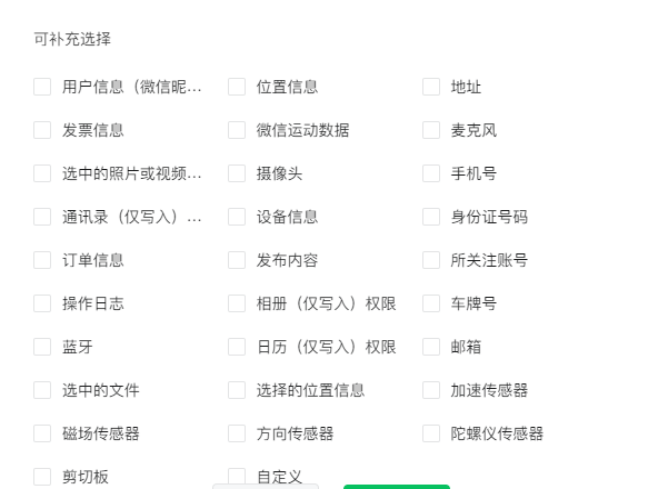 像你这个,这里面的用户信息,手机号,身份证号码,邮箱,都要勾选,还有选中的照片视频,摄像头,选中的文件