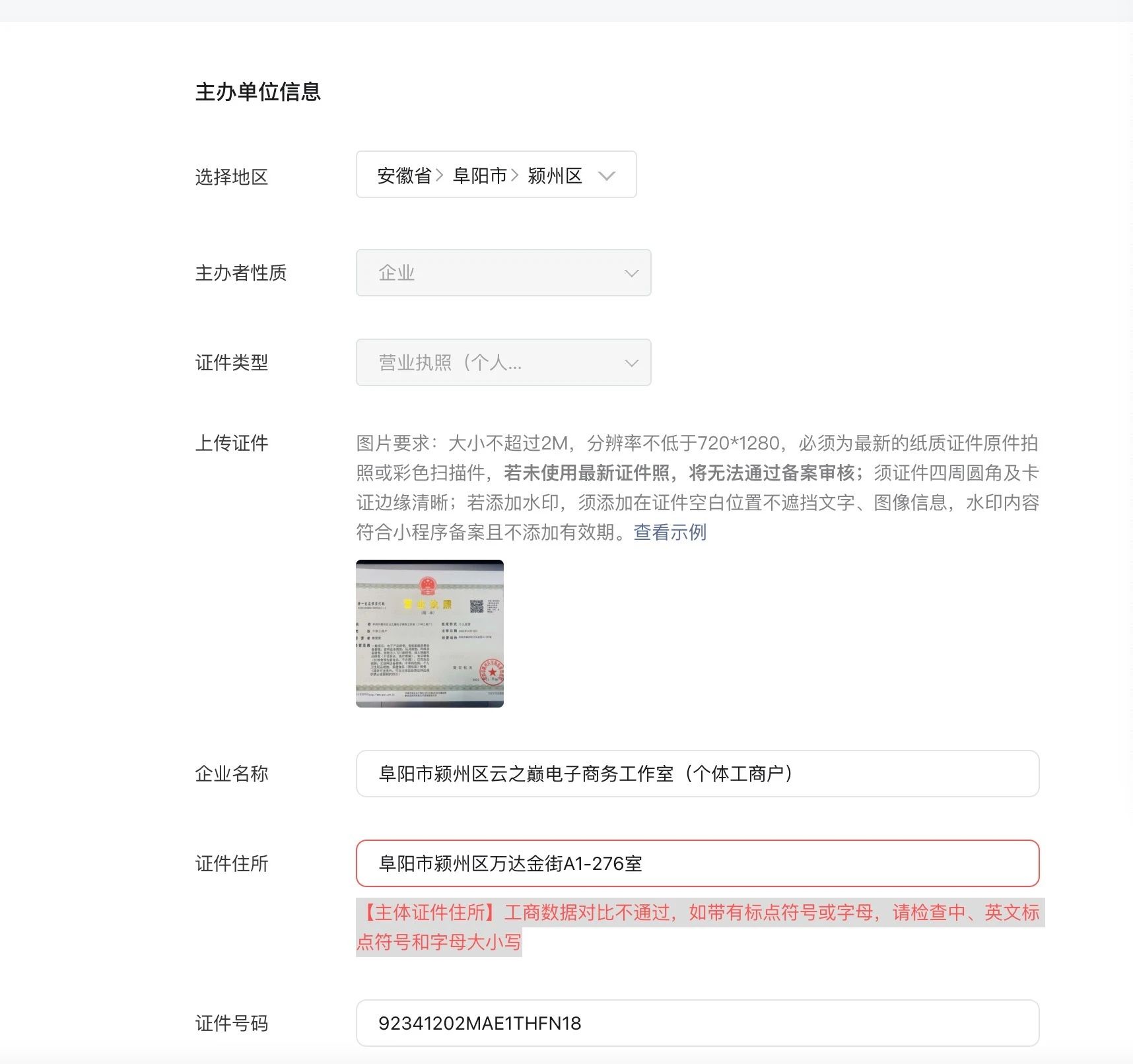 【主体证件住所】工商数据对比不通过,如带有标点符号或字母,请检查中、英文标点符号和字母大小写?
