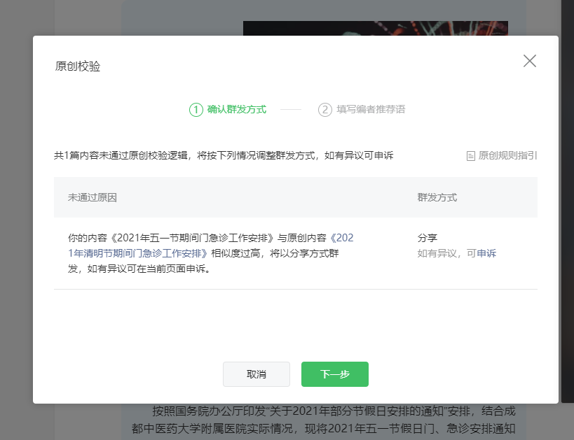首先我们的文章并没有申明原创,因为这就是一个模版,之前也是这样发的,但是从来没有遇到过这样的问题,但是这次却有这样的提示,我们本来单位就需要一样的模版发布一些消息,一直联系不上人工, 客服又无法解决问题。