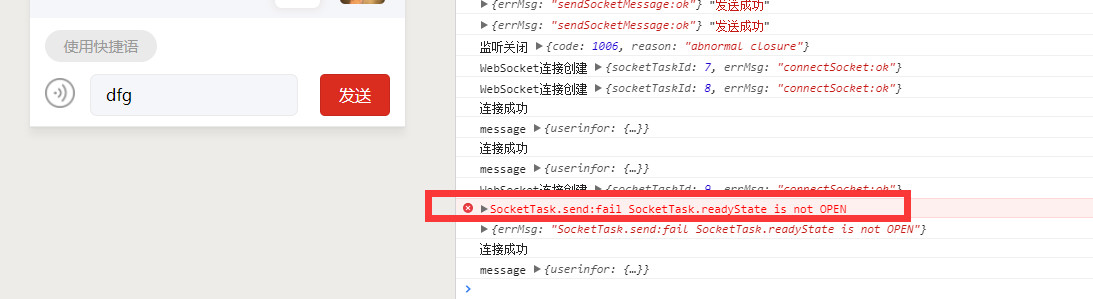 使用小程序websocket进行会话聊天,断开后再次创建连接会话,监听打印是连接成功的,心跳包也能正常发送成功,却不能正常发送消息,提示SocketTask.send:fail SocketTask.readyState is not OPEN,请问怎么处理呢?