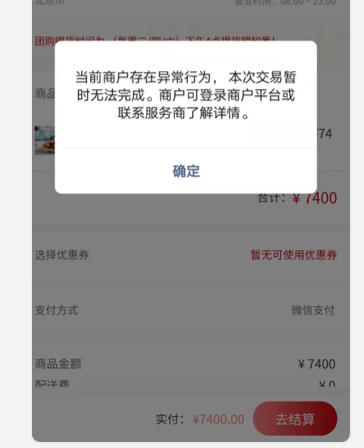 2、如无拦截记录,可以根据页面提示联系付款方更换付款账号/更换支付方式/降低支付额度等方式解决。