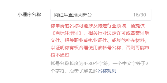 你申请的名称可能涉及特定行业领域,请提供《商标注册证》、相关行业法定许可或备案证明文件、相关职业或执业证件、或其他补充材料,以证明你有权合理使用该帐号名称,否则可能审核不通过