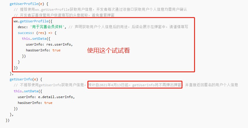 // 不推荐使用getUserInfo获取用户信息,预计自2021年4月13日起,getUserInfo将不再弹出弹窗,并直接返回匿名的用户个人信息