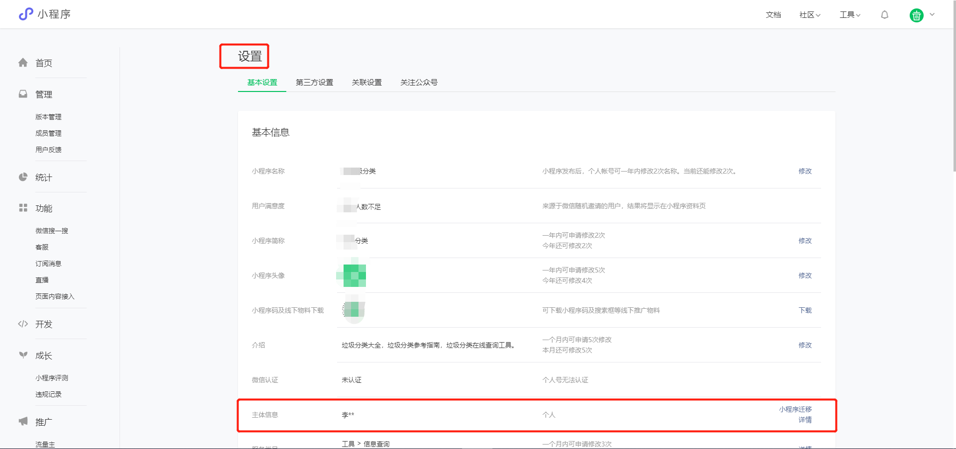 我自己因为需要注册了一个小程序,现在也不记得是注册的是个人还是企业的了,请问下哪里可以看看小程序的类型,企业还是个人?