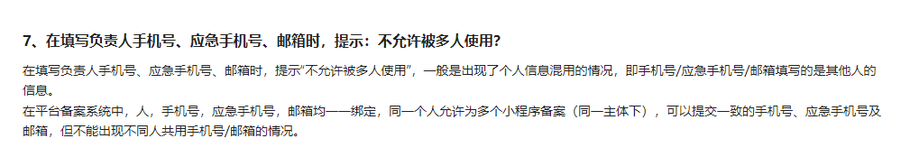 本企业名下10+小程序,分为不同管理员。在备案小程序时,要求填写主体负责人号码,要求不同的全新号码(没有备案过小程序的)。请问这是什么逻辑??另外,填完主体的后,到下一步的管理员信息,也要求不同号码。要求管理员的号码是全新的,我可以理解。但要求主体人的,每备案一个小程序都要求不同的。我们去那找那那么多号码???应急手机号码也一样。备案10,相当于要20个号码!!再加上小程序管理员主体人时,备案10个小程序就是要40个号码!!!!请给答复