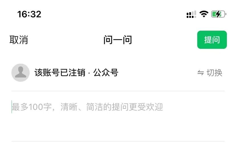 今天想在问一问提个问题,但是看到账号显示“该账号已注销*公众号”。