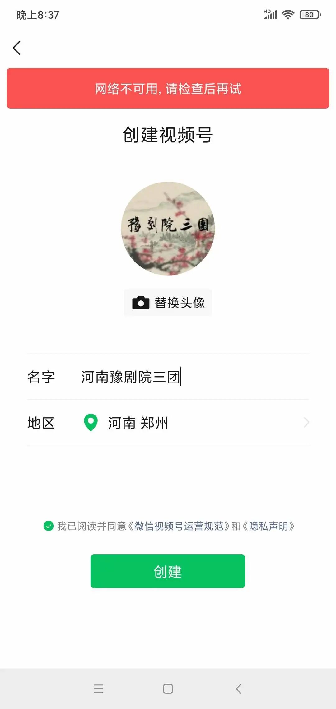 创建视频号 一直提示网络不可用 网络是正常的 微信号是:Henanyjy3t
