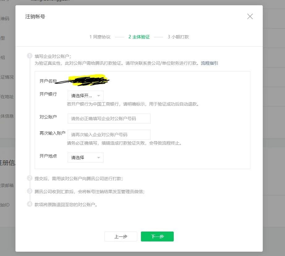我单位账号为服务号,今天申请注销的时候,让填写对公账户,现在因单位改革,单位名称已经更换了名字,和认证时的主体单位开户名称不一样,而且