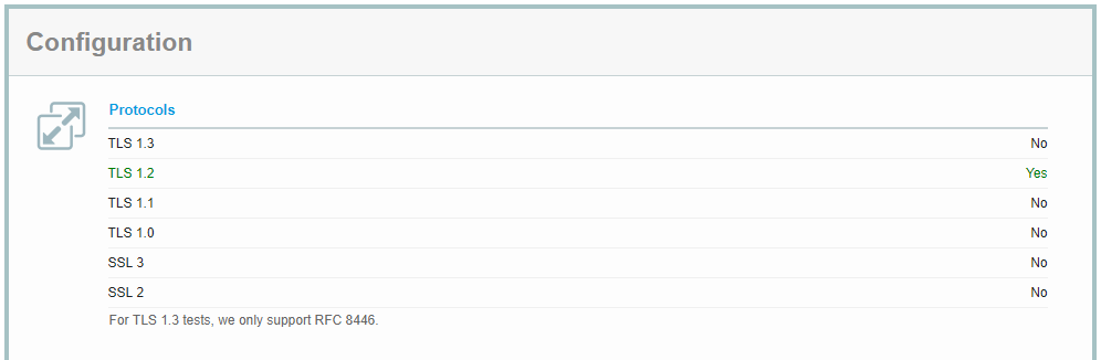 这是我的服务器的检测结果,只有TLS1.2是YES的。