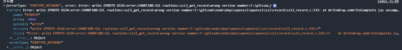 调用ocr接口报错ERRTYPE_NETWORK,message: "write EPROTO 6524:error:1408F10B:SSL routines:ssl3_get_record:wrong version number:F:\gitcode\node\deps\openssl\openssl\ssl\record\ssl3_record.c:332? 这是什么问题呢?
