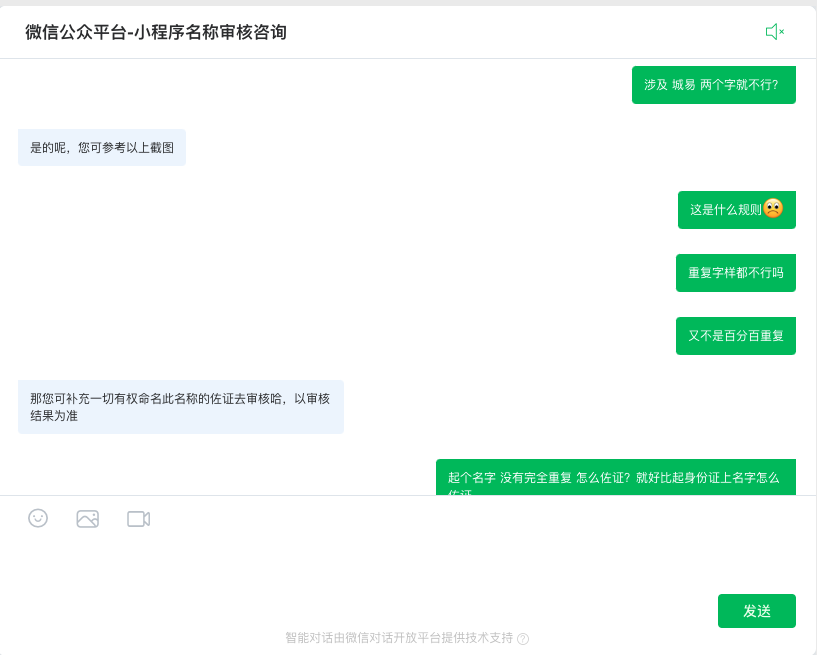 这个要求有点吹毛求疵了吧,没有完全命中他人商标/名称,起名还要提供材料佐证,客服人员一直在车轱辘话进行回答问题,没有实质解决或建议