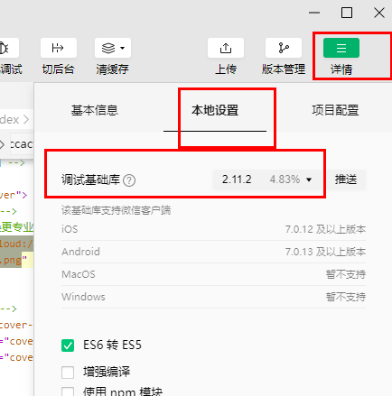 调试基础库要用高一些的版本,我之前用的2.0.4不可用,选择新的版本号就可以了。