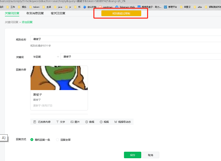 如果想超过这个限制的,可以自己搭建服务器,自己配置关键词回复;或者授权第三方平台,设置关键词回复。