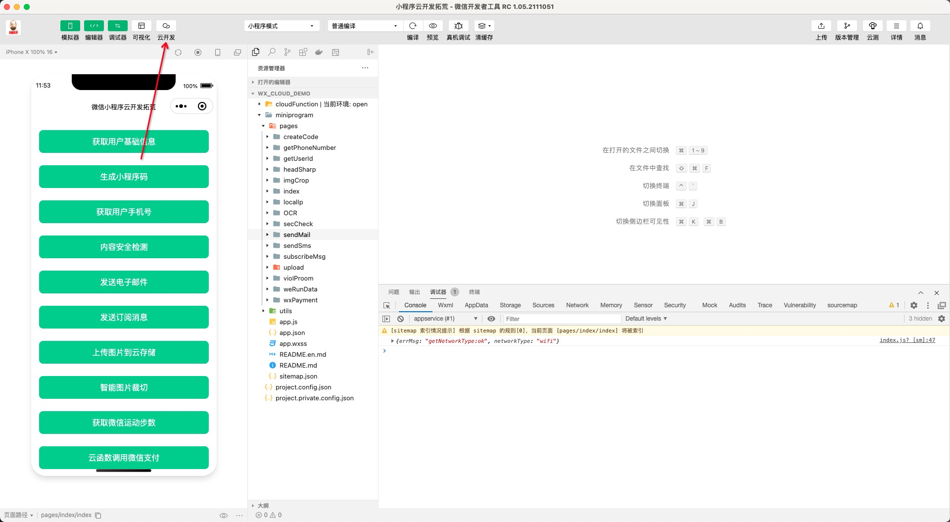 或者你新建的不选择云开发,创建好后在IDE里面,左上角有个云开发,点击开通(这样就是没有模板的代码)