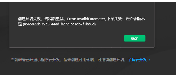 Invalidarameter, 下单失败:账户余额不足 (b1e09342-246b-4033-85bd-640415f92bc5)创建环境失败,请稍后重试。Error: Invalramete
