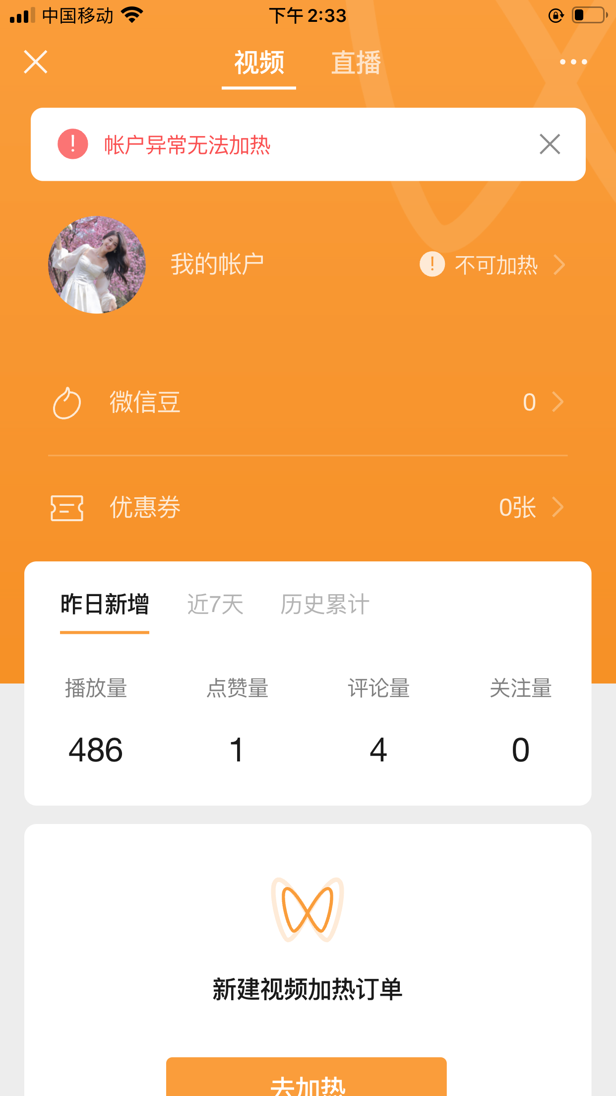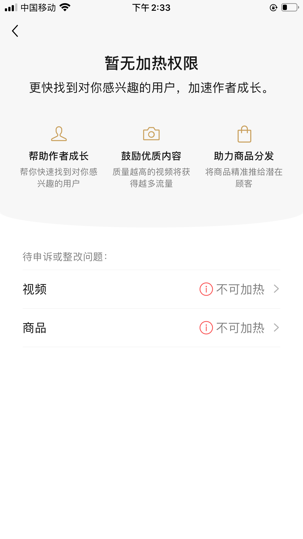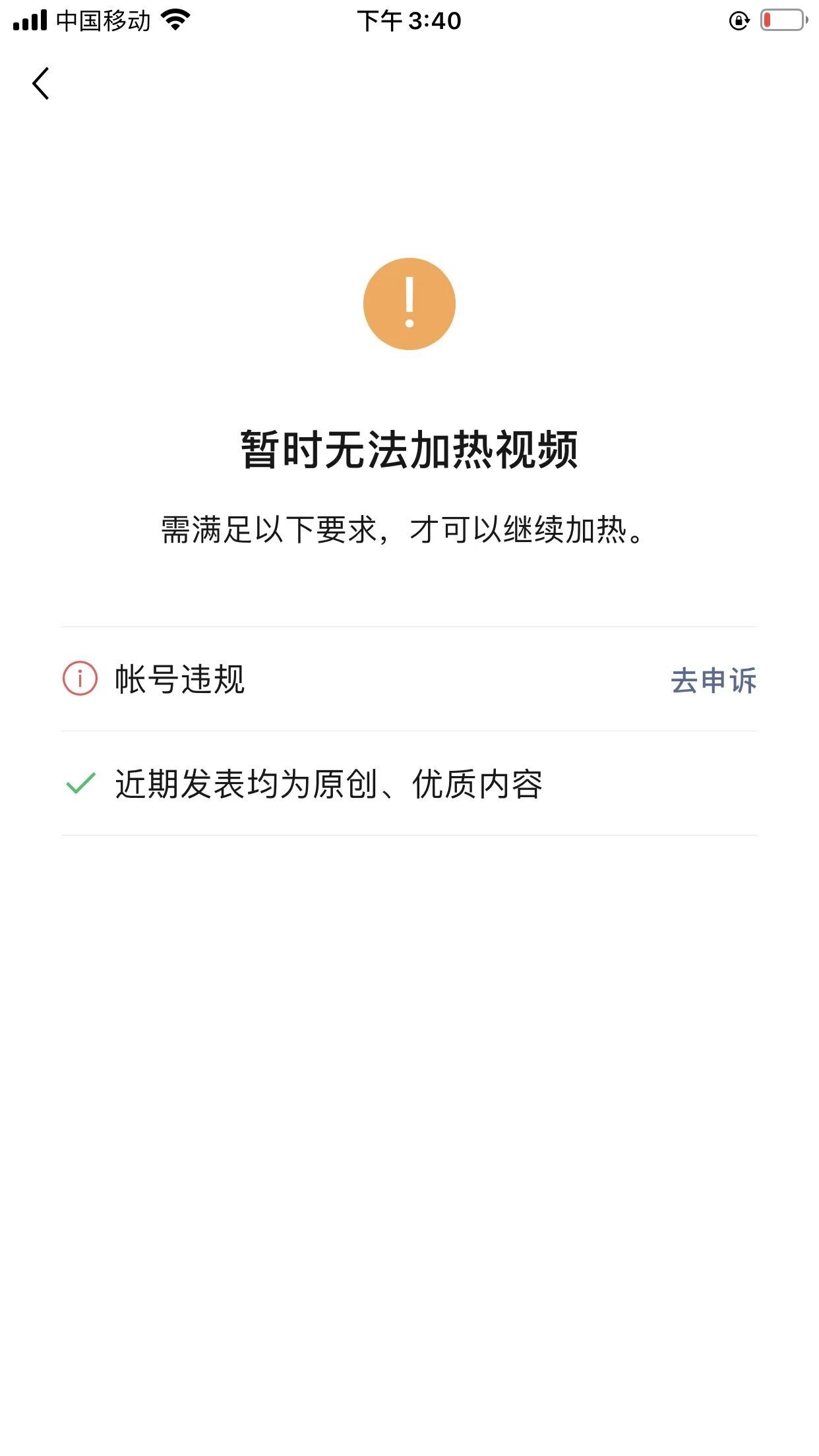 账号没有收到违规通知,信用分也是100分,但是没有播放量,除了自己点击浏览的,没有外来的浏览量。其他一切都正常点击加热工具的时候,显示账号违规,无法加热,然后是视频违规,但是点申诉没有反应。 客服发邮件也没有收到回复。现在就是不知道有什么问题,怎么去整改?