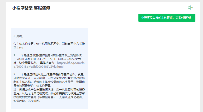 你好,若企业在工商局更名、政府机构改革导致的主体名称变更等情况。如果符合上述情况,可以登录小程序后台申请修正主体名称 详情请参考: https://kf.qq.com/faq/200918qMzEbi2009186VZVju.html