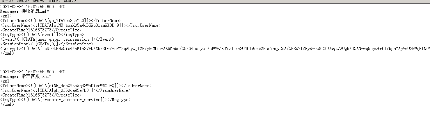 下图是服务器日志,上面是接收到的信息,下面是返回出去的信息。contentType设置"text/xml",反出去的touser和fromuser与接收到的对调了。