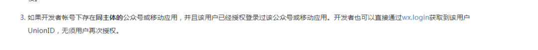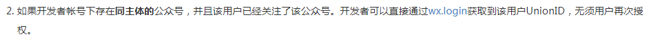 两个小程序 属于同主体 并且绑定了同一个开放平台下,小程序A通过button 授权后,在小程序B不授权的情况下 通过wx.login没法获取到unionid。用的就是第三种方法。(未关注公众号)官网说明如下: (这里的所说的授权是我理解错了么????还是说第三种方法也要关注公众号??)