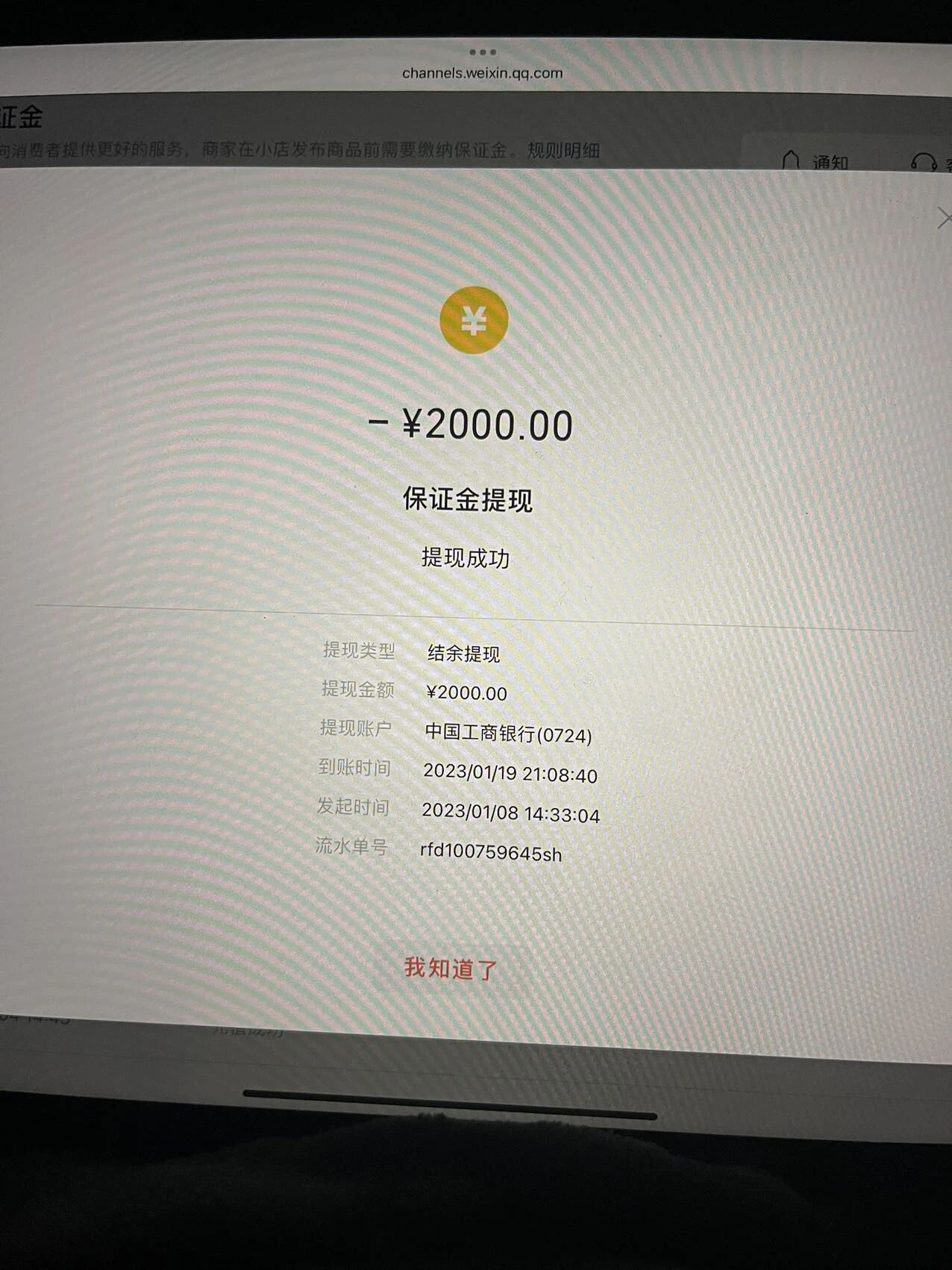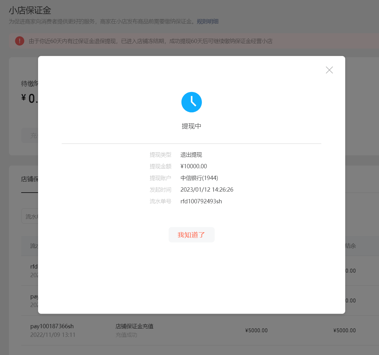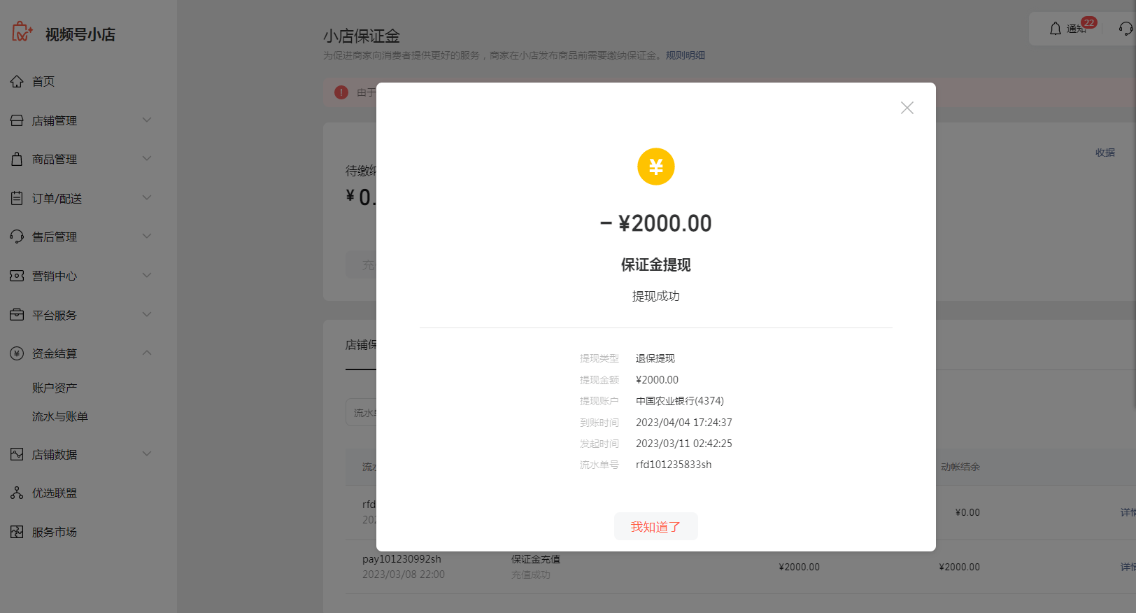 说了无数遍了,银行卡正常! 我货款提现也正常!就保证金这2000蒸发了一样,