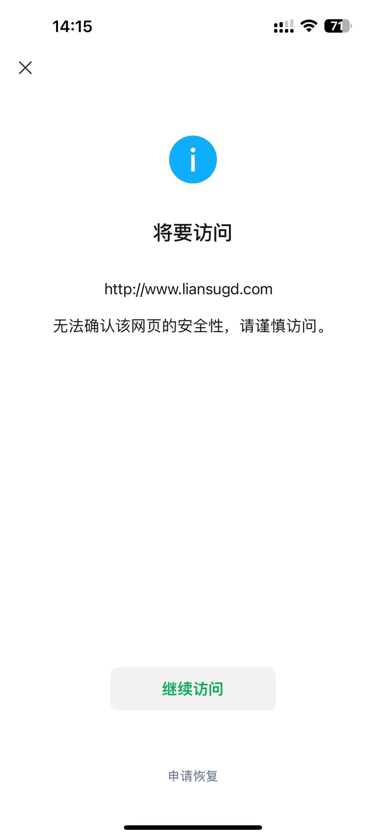 您好,域名(www.liansugd.com),浏览器访问正常,我是网站开发者,访问时间如图2024/6/25,微信访问网站出现“无法确认该网页的安全性,请谨慎访问”,经检查网页里没有不安全的内容,请核实后帮忙解除拦截,谢谢!