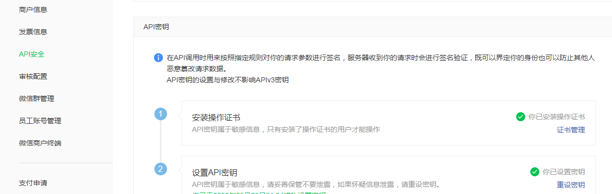 3.贴吧有人说是密钥要重置可能是因为微信平台有缓存的原因(在这里表示已经在服务商平台里面的api安全里面重置过密钥了,但是还是一样的情况,情况还是只能下单不能支付,如下图)