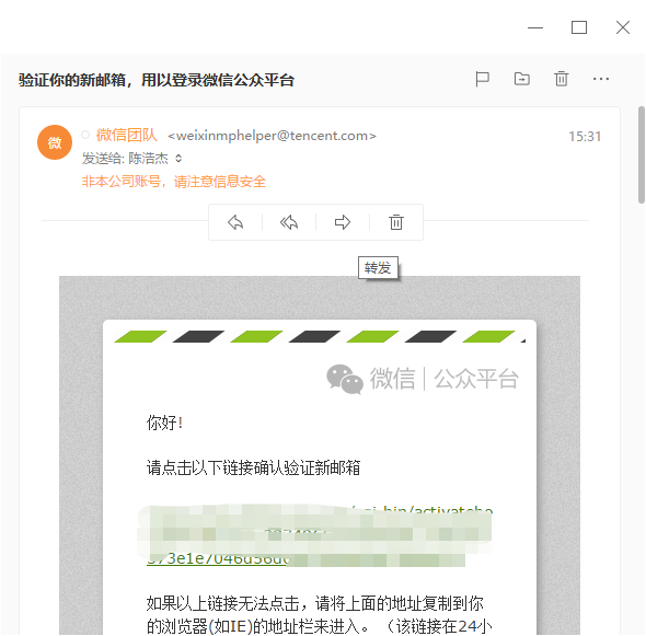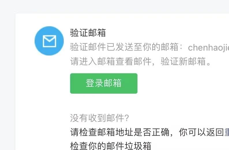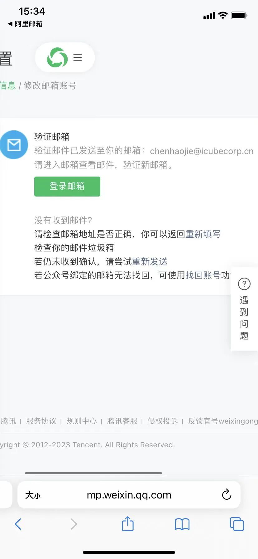第一步,服务号的邮箱绑定了一个新邮箱(C)成功了。但是在订阅号把公司邮箱(B)替换成工作邮箱(A)。在最后一步,我在工作邮箱(A)里验证验证邮箱,提示“邮箱已被占用,请更换邮箱再重试”。