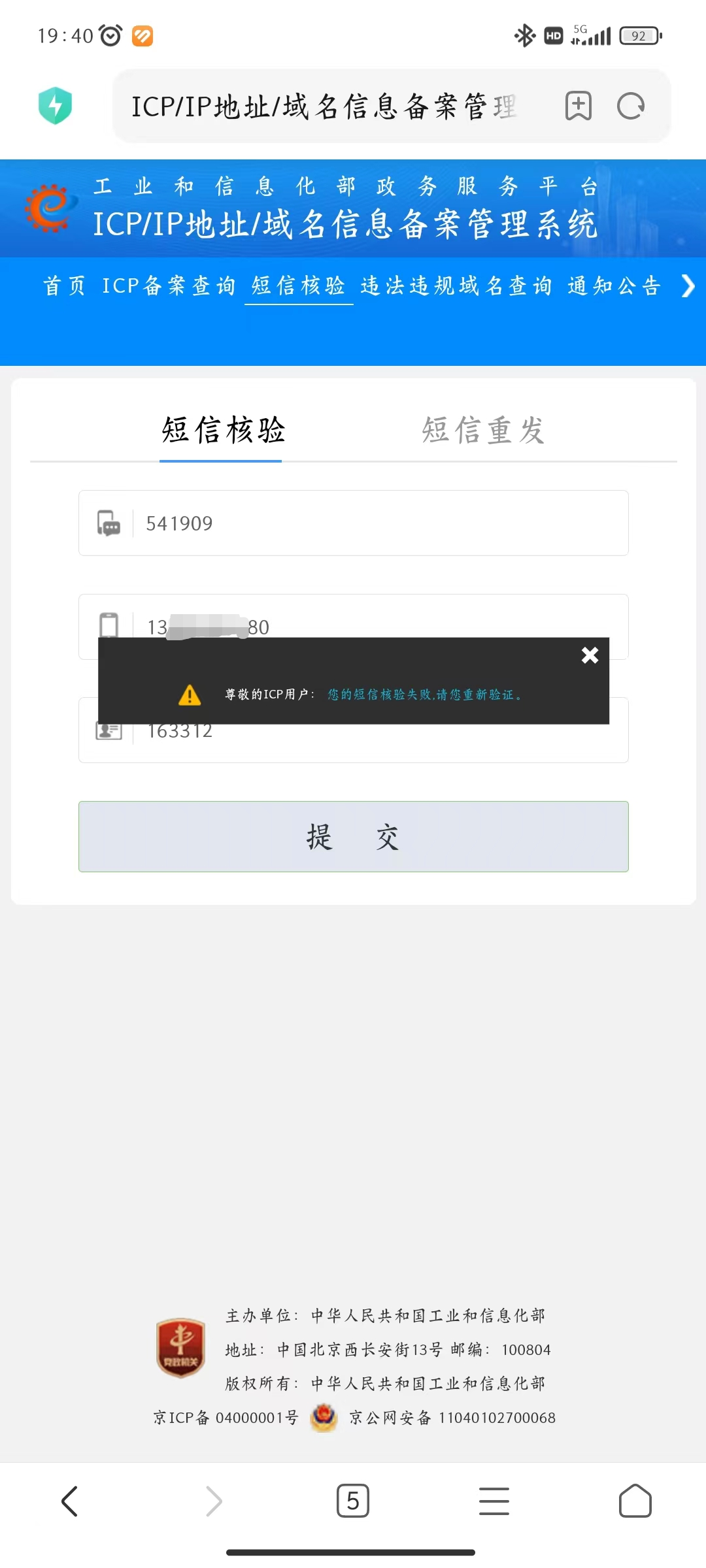 收到工信部备案短信后,点击链接进入到核验界面,但却不断出现下图提示,请问是哪个环节出错了吗?