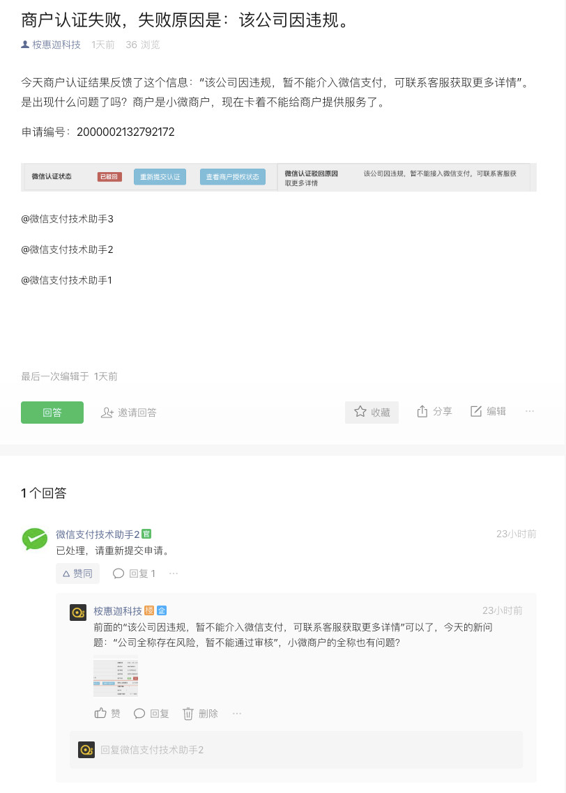 上次反馈的“该公司因违规,暂不能介入微信支付,可联系客服获取更多详情”是已经解决了,但重新提交申请又出现新的问题“公司全称存在风险,暂不能通过审核”,小微商户的全称也有问题?