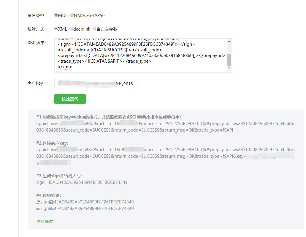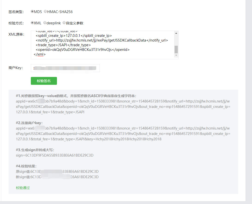 选择MD5,XML,然后把请求参数xml放进去,就能校验签名。