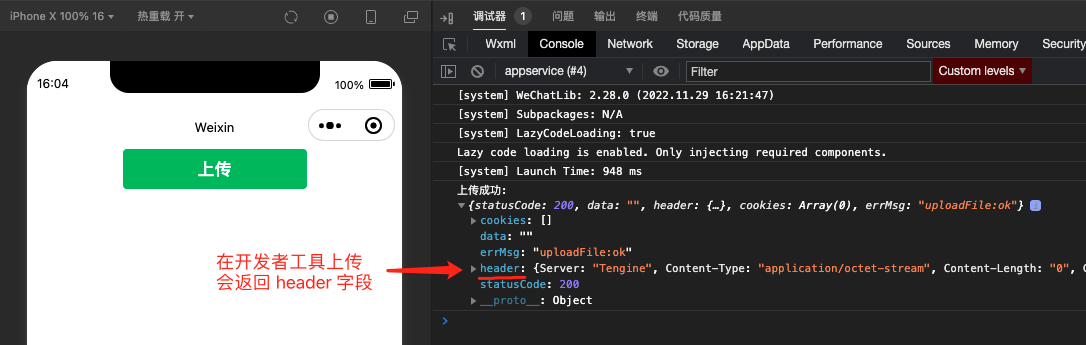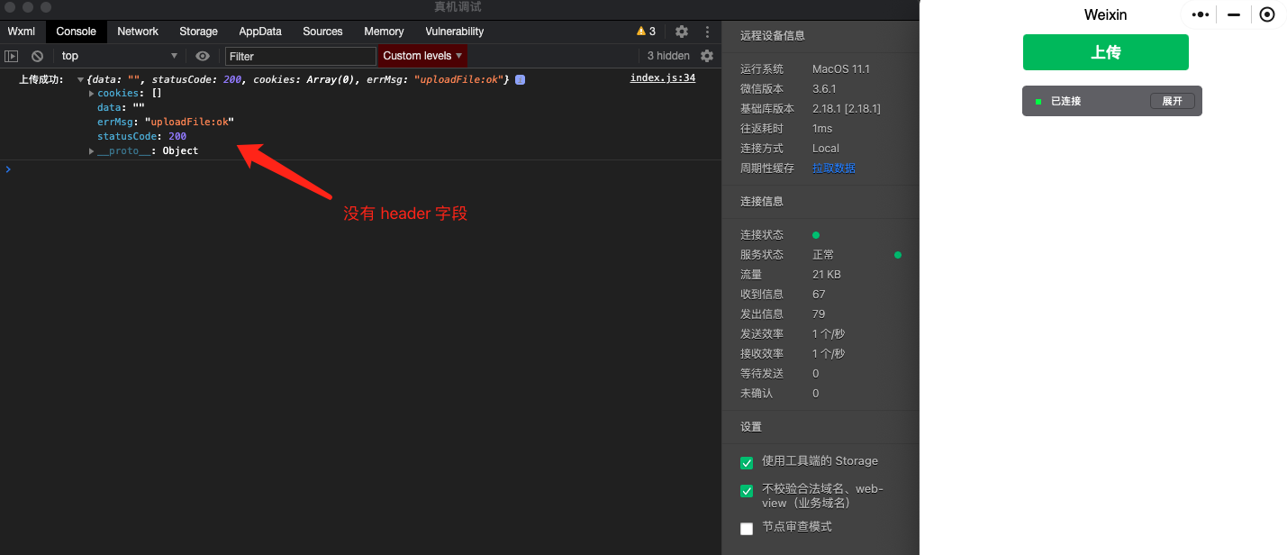 wx.uploadFile 方法在调试工具和移动设备上会在 success 回调中返回响应头 header 字段,但是在 PC 端小程序调用则未返回该字段。