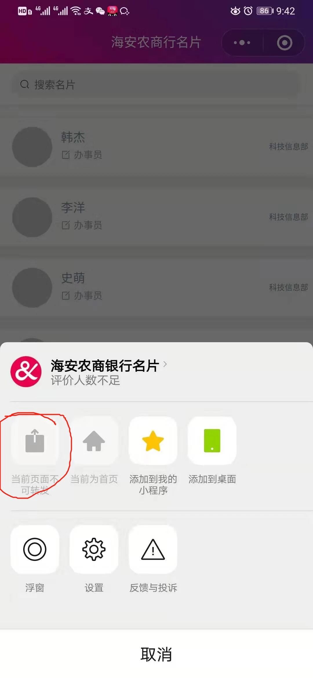 js里面有没有onShareAppMessage函数或者看看js页面有没有wx.hideShareMenu这个api,没有函数就加上,有wx.hideShareMenu就把它干掉