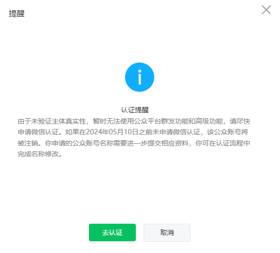 指的是微信认证吗?你可以选择不认证,未认证就没有部分高级功能,具体可参考下图: