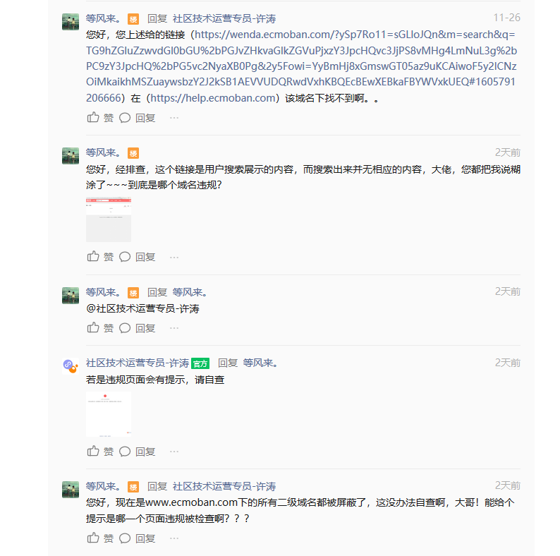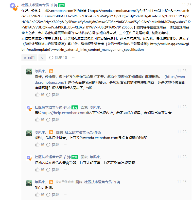 ecmoban.com是我司的顶级域名,该域名还有几个二级域名:《help.ecmoban.com》《news.ecmoban.com》《about.ecmoban.com》《wenda.ecmoban.com》前段时间反馈,该域名在微信内置浏览器内打不开,反馈已停止访问该网站,经反馈,管理员给出的反馈比较模糊,弄的我不清楚究竟是哪一个域名内有违规内容,还请管理帮帮忙详细反馈下究竟是哪个域名出现违规内容,我司将积极配合处理。
