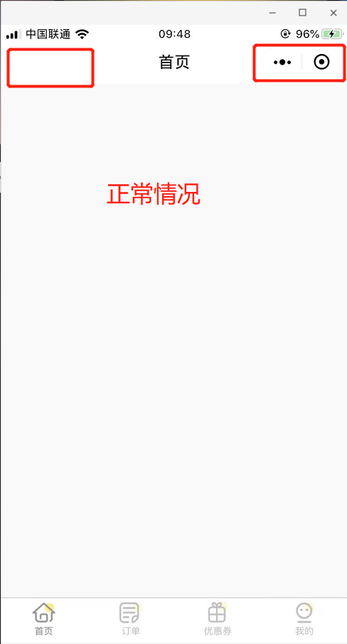 用户反馈进入小程序首页有问题,就是首页是配置在tabbar中的,而且用户显示的页面顶部导航栏右上角胶囊也消失了,只有三个小点点,左侧神奇的出现了返回图标,顶部导航兰系统配置默认,没有改,详情见截图,由于用户找不到,当时系统版本,微信版本未知,可能系统版本较低,但是可以进入小程序