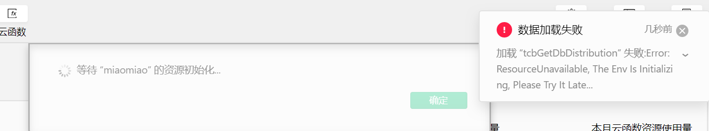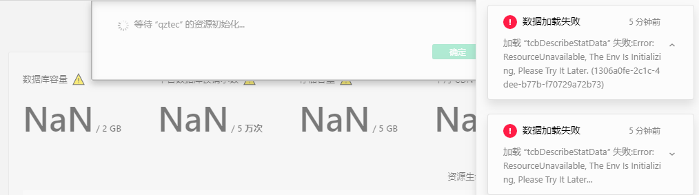 一直显示资源初始化,大概有20多分钟了,打开云开发控制台,报错:加载 “tcbDescribeStatData” 失败:Error: ResourceUnavailable, The Env Is Initializing, Please Try It Later.appid:wx0f5a41ef4266d7f0