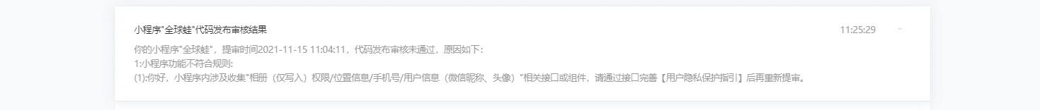 1:小程序功能不符合规则:(1):你好,小程序内涉及收集"相册(仅写入)权限/位置信息/手机号/用户信息(微信昵称、头像)"相关接口或组件,请通过接口完善【用户隐私保护指引】后再重新提审。失败原因 1:小程序功能不符合规则:(1):你好,小程序内涉及收集"相册(仅写入)权限/位置信息/手机号/用户信息(微信昵称、头像)"相关接口或组件,请通过接口完善【用户隐私保护指引】后再重新提审。