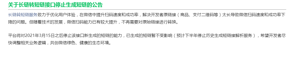 公告是说:平台将对2021年3月15日之后停止该接口新生成的短链的能力,已生成的短链暂不受影响(预计下半年停止历史生成短链接解析服务)。